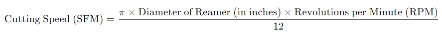 Kecepatan potong, atau kecepatan permukaan, mengacu pada kecepatan pergerakan ujung potong alat untuk membesarkan lubang melintasi benda kerja. Biasanya diukur dalam kaki permukaan per menit (SFM) atau meter per menit (m/mnt). Untuk menghitung kecepatan potong yang tepat untuk alat untuk membesarkan lubang, gunakan rumus berikut: