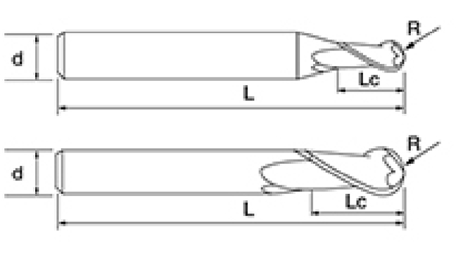 | Tidak. | Diameternyanya D | Sudut R R | Panjang Seruling Lc | Panjang Keseluruhan L | Shank Dia d | Jumlah Pisau F |