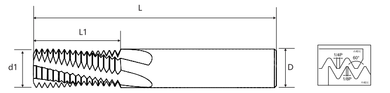 | Pitch | Gigi Kasar PBB | Gigi Halus UNF | Gigi Sangat Halus UNEF | Diameter Pisau d1 | Panjang Bilah Efektif L1 | Diameter Pegangan D | Panjang Keseluruhan L | Jumlah Pisau | Diameter Lubang Bawah |